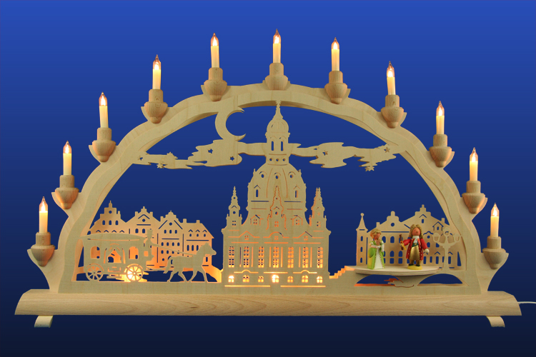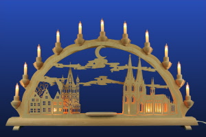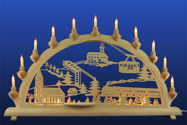 Dieser Lichterbogen (680x350mm) besteht aus einem Grundmotiv und einem abnehmbaren Vorsteckmotiv mit Stellfläche. Wahlweise mit oder ohne Figuren. Sichtbar sind 11 Kerzenlampen und 4 Toplampen dienen als Innenbeleuchtung.